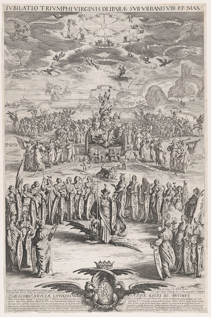 In this elaborate thesis print, text and image are integrated rather than printed on separate sheets. Designed for a theological defense that took place in 1625 at Rome’s Franciscan Aracoeli convent, the print highlights the doctrine of the Immaculate Conception of the Virgin, who is seen at center treading upon a dragon and surrounded by allegorical figures of her so-called mysteries. Above, the Virgin is seen again in a triumphal chariot, foreshadowing her jubilant Assumption into heaven. The long text at bottom dedicates the print to the Duke and Duchess of Lorraine.