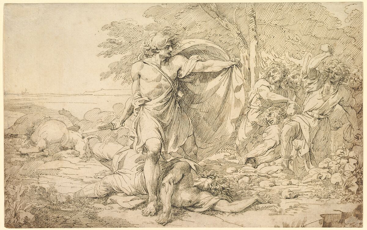 Mortimer’s bravura penwork in this sheet is characteristic, but his choice of a classical subject is unusual. The artist was known for his Romantic banditti pieces in the spirit of Salvator Rosa and his imaginative compositions featuring Oriental heads and playful monsters. In this scene, a warrior, whose pose echoes that of the Apollo Belvedere, straddles the body of a fallen companion and grasps a short sword while holding up his cloak to protect himself from primitive attackers armed with clubs and stones. Fallen horses at left indicate a recent battle, while a tiny sailboat on the horizon adds a narrative touch. Mortimer usually made detailed pen drawings of this sort in preparation for related etchings, but the present composition was not turned into a print and its literary source remains unknown.