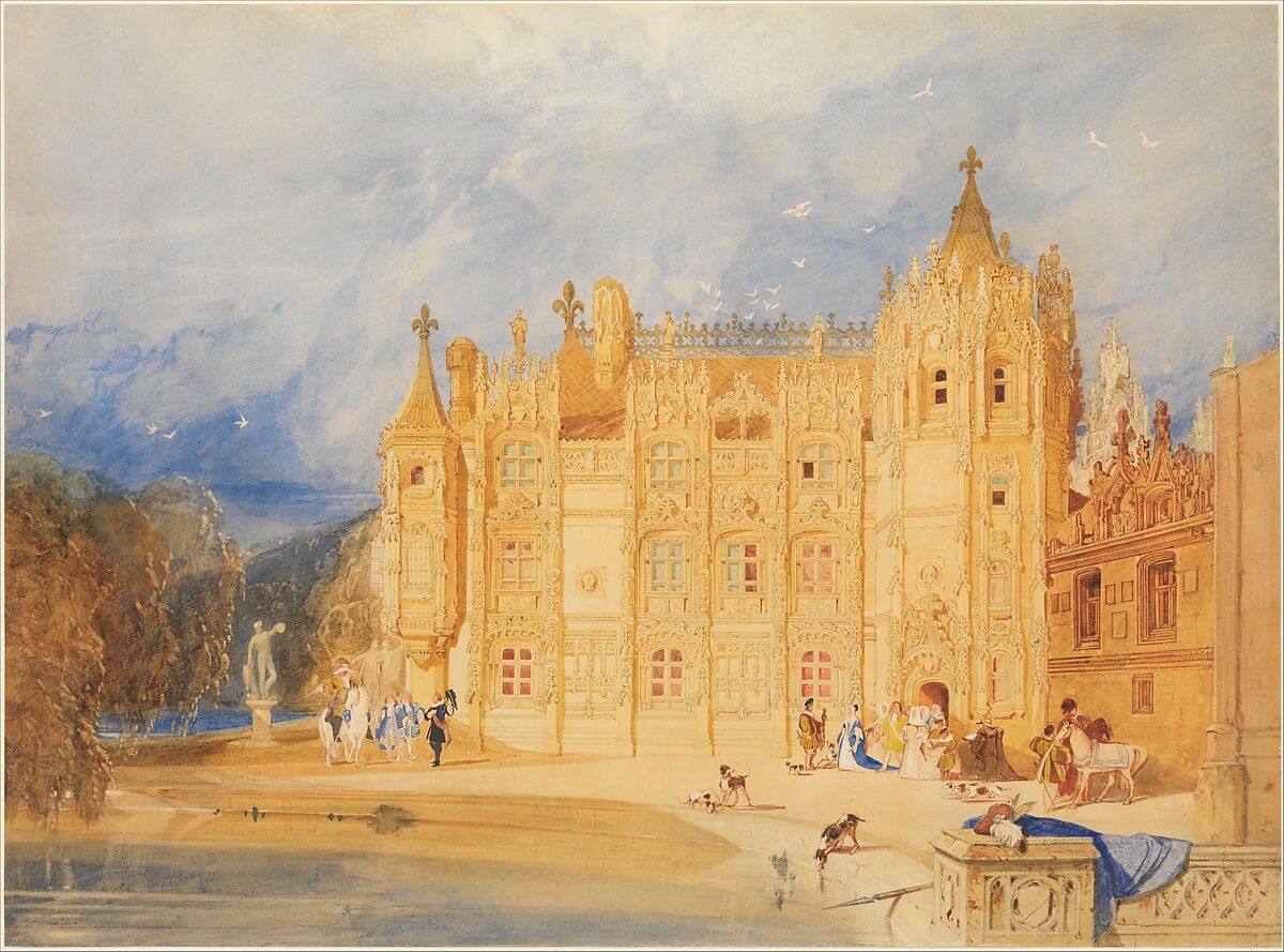On three trips to Normandy between 1817 and 1820 Cotman planned a series of etchings focused on French medieval architecture. His imaginative reconstruction of the Abbey of St. Ouen, which had been demolished in 1815–16 to enlarge Rouen’s town square, was likely stimulated by local distress over that loss. He transformed what had been an enclosed courtyard into a garden facade, enlivening the scene with figures in seventeenth-century costume. The imagery derives from engravings in J. F. de Pommeraye’s Histoire de l’Abbaye Royale de St. Ouen (1662), owned by Cotman’s English patron, Dawson Turner. Declaring the Abbey of St. Ouen "the best subject I ever touched on," Cotman exhibited four versions of it between 1824 and 1831; this one likely dates late in the series.