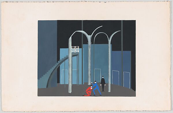 This print encapsulates Exter’s design for the opening scene of Shakespeare’s Othello and comes from a group of prints that distills her innovative ideas. As an influential modernist painter and stage designer, the artist moved between her native Russia, Germany, and France before settling in Paris, where she taught at the Académie de l’Art Moderne. In a radical new approach to staging, colored screens represent Venetian facades, and a spiral stair leads to a lightly indicated balcony outside the room where Desdemona’s father sleeps. Below, Iago and Rodrigo simulate a robbery to wake the senator so they may inform him that his daughter has eloped with Othello.
