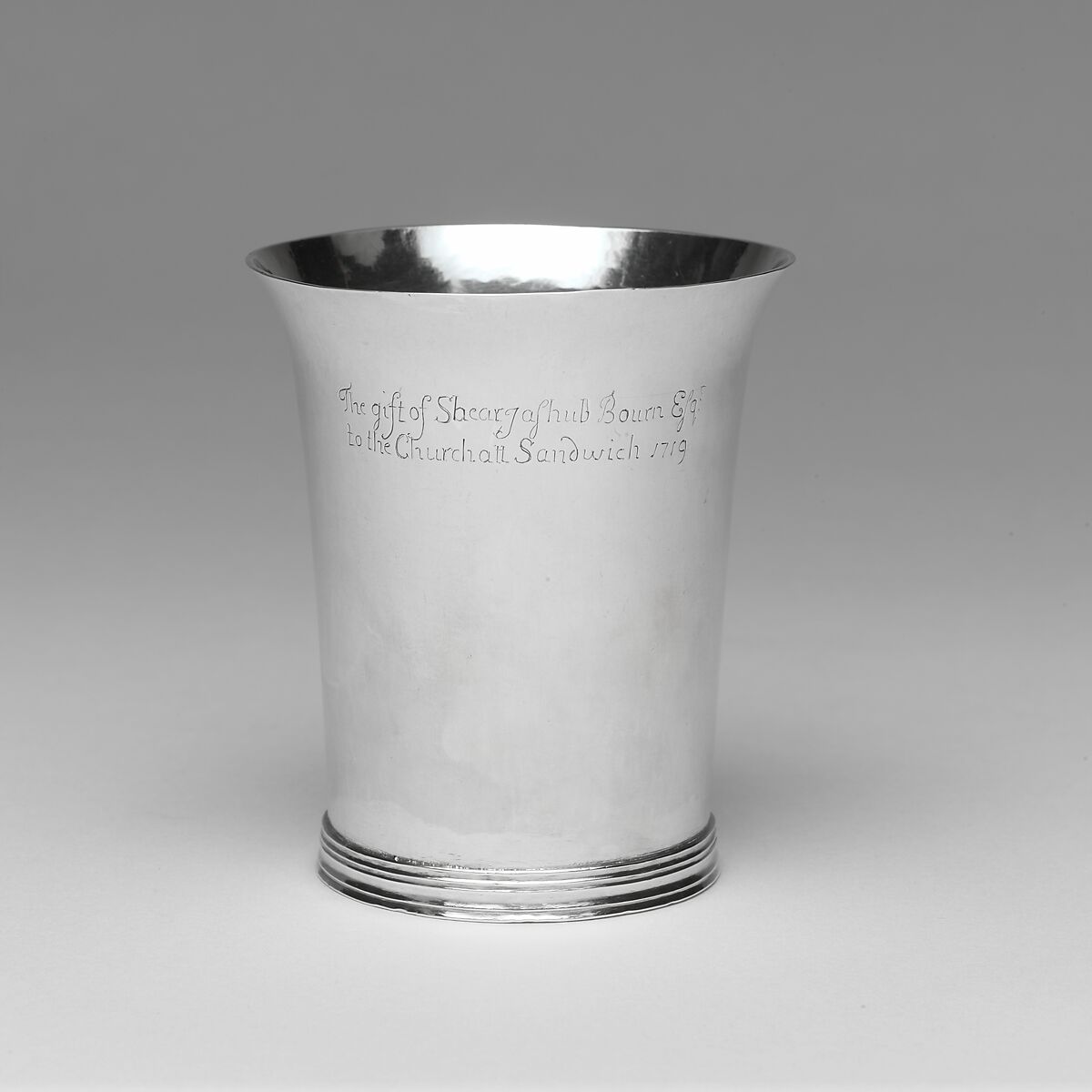 The sum of eight pounds bequeathed by Shearjashub Bourn[e] to the church in Sandwich, Massachusetts, likely was used to purchase these two beakers. Bourne was a prominent and affluent citizen whose wealth derived from a lucrative trade he carried on with Native Americans. At his death, Bourne's estate was appraised at £943.1s.4d. Although a domestic form, beakers often were used as communion cups. These beakers appear to have served as models for four other beakers made for the church in the nineteenth century by Lewis Cary.