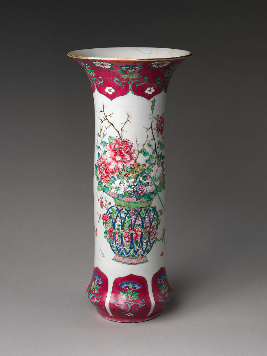 This vase, its mate, and the large jar with the same decoration were most likely made for use in a European home, where they would have been displayed on a mantle or shelf.