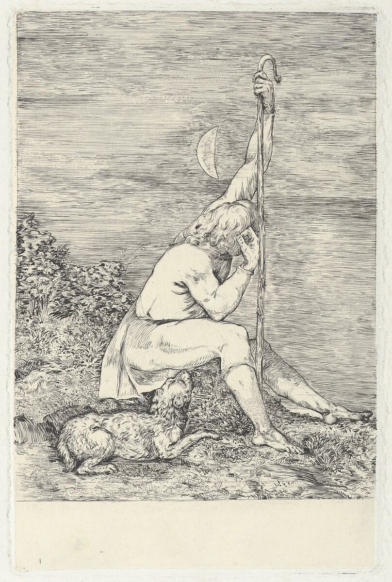 Sherman belonged to "The Ancients," an artistic brotherhood based at Shoreham, Kent in the late 1820s and early 1830s. His engraving of a youthful shepherd dreaming by the sea is based on a drawing by Samuel Palmer, who wrote in 1828, “If Mr. Sherman have finish’d his print he need not wait ‘til I see it, but may bring it out directly...as the more copies are sold the sooner the plate will be his own.” The work was never published, however, and only five copies are known. The mysterious image conveys Palmer’s admiration for Albrecht Dürer’s "Melancholia", as well as his closeness to George Richmond, a friend and fellow Ancient, whose own "Shepherd" engraving of 1827 describes a figure with a muscular twisted arm gripping a crook.