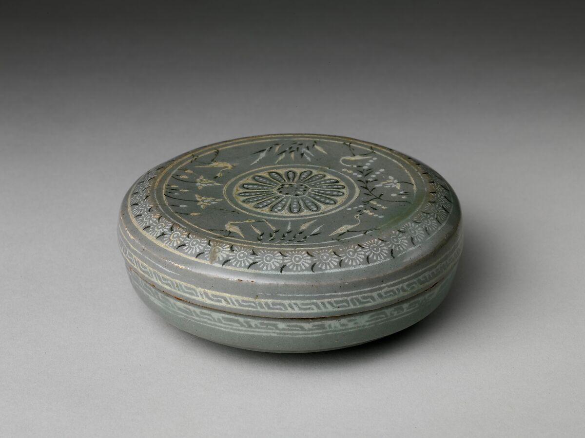 - 靑磁 象嵌菊花柳蘆水禽文 盒 高麗