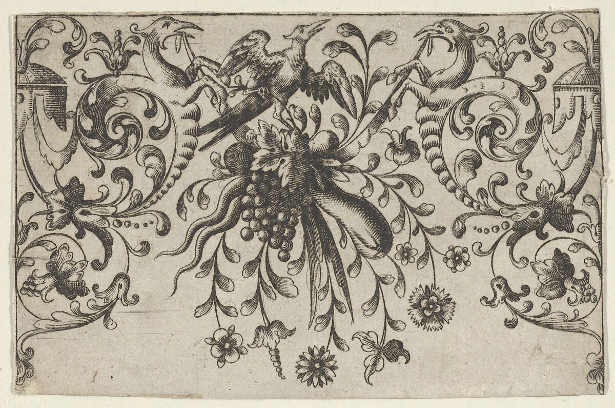 Ornament design with a bird standing on its left leg, facing right on a bushel of fruit (including grapes), at center. To the left and right, grotesques with bird's heads and horse's legs. From a set of ten plates.