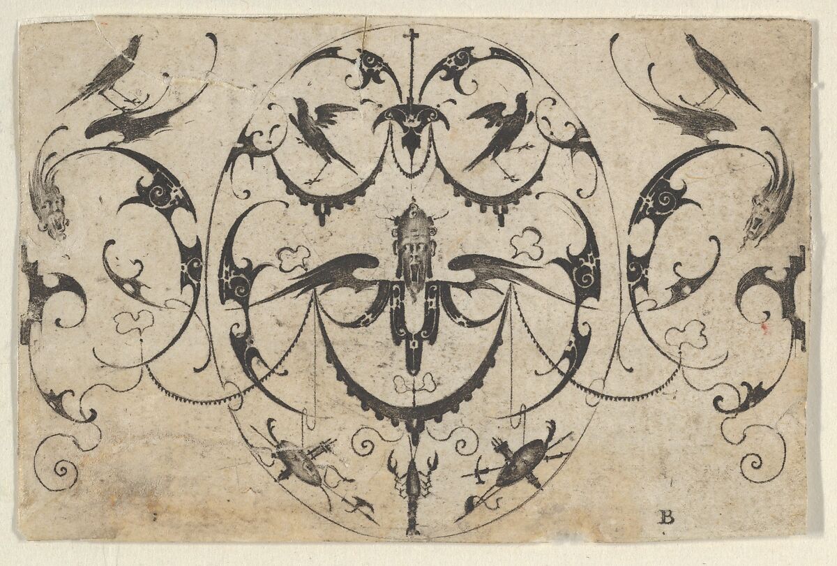 Ornamental grotesque panel with winged face at center surrounded by blackwork in an oval at center. At bottom, a lobster. Two birds perched on wings of grotesques at left and right of the central oval.