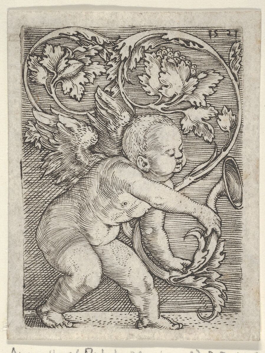 Ornamental design with a cupid facing right, holding the end of scrolling vines.