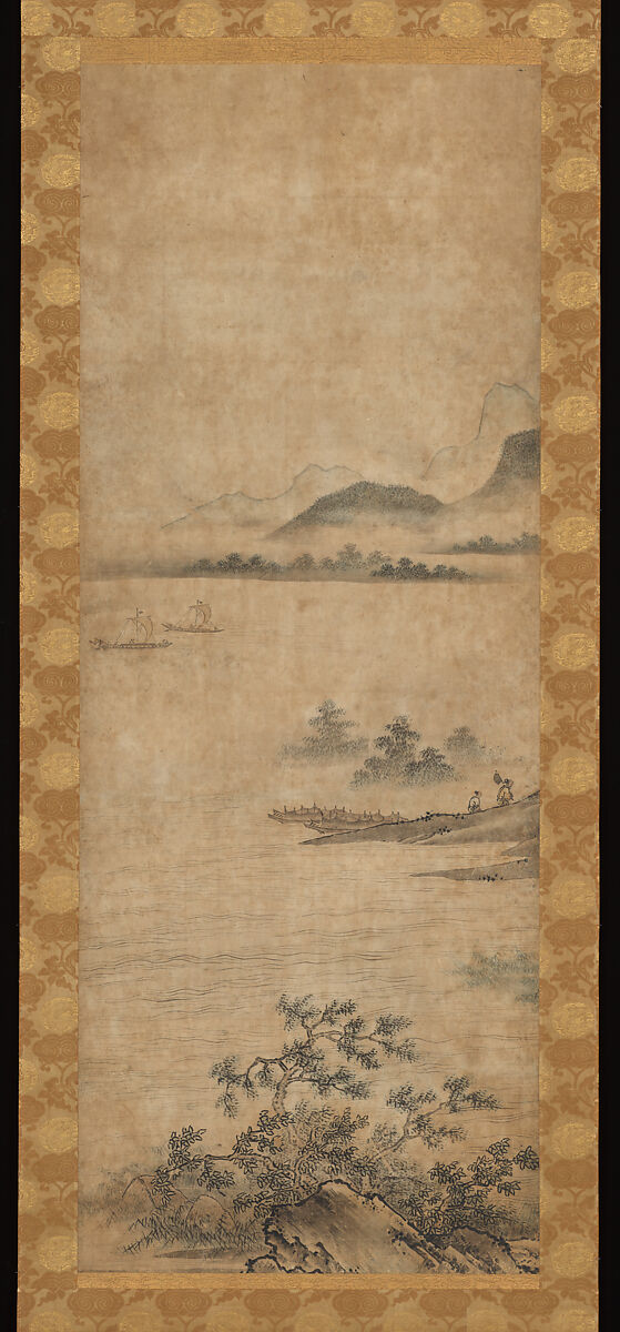A celebration of emotional responses to nature’s changing moods, the “Eight Views” theme first developed in Chinese poetry and painting of the eleventh century. It was introduced to Japan in the fourteenth century, where it became a major subject of ink painting. The bustling central image of this triptych represents “Mountain Market in Clearing Mist.” At left, a blustery atmosphere pervades “Sails Returning from a Distant Shore” and “Night Rain on the Xiao and Xiang Rivers,” while at right, in “Evening Glow on the Fishing Village,” the sunset envelops a river landscape, with fishing nets left to dry by the shore. Perhaps once part of a complete series, the paintings demonstrate the expansion in Japan of the album-leaf composition, which was associated with the aesthetic sensibilities of China’s elite military class and with related expressions of political standing. .