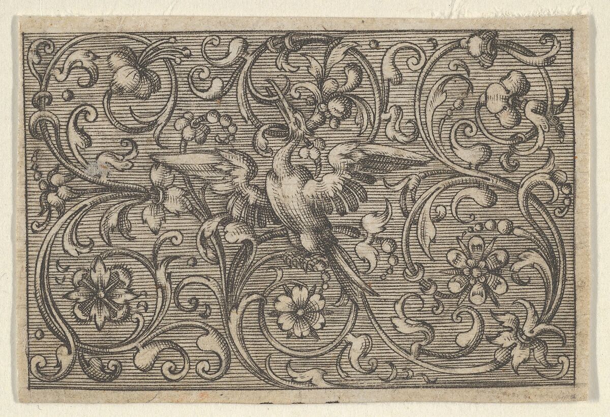 Ornamental frieze with a large bird with out-stretched wings at center, surrounded by scrolling tendrils. The bird holds the end of a tendril in its long, straight beak. From a series of six plates with horizontally hatched backgrounds. According to Berliner, the backgrounds of the plates in this series were further darkened at a later date.