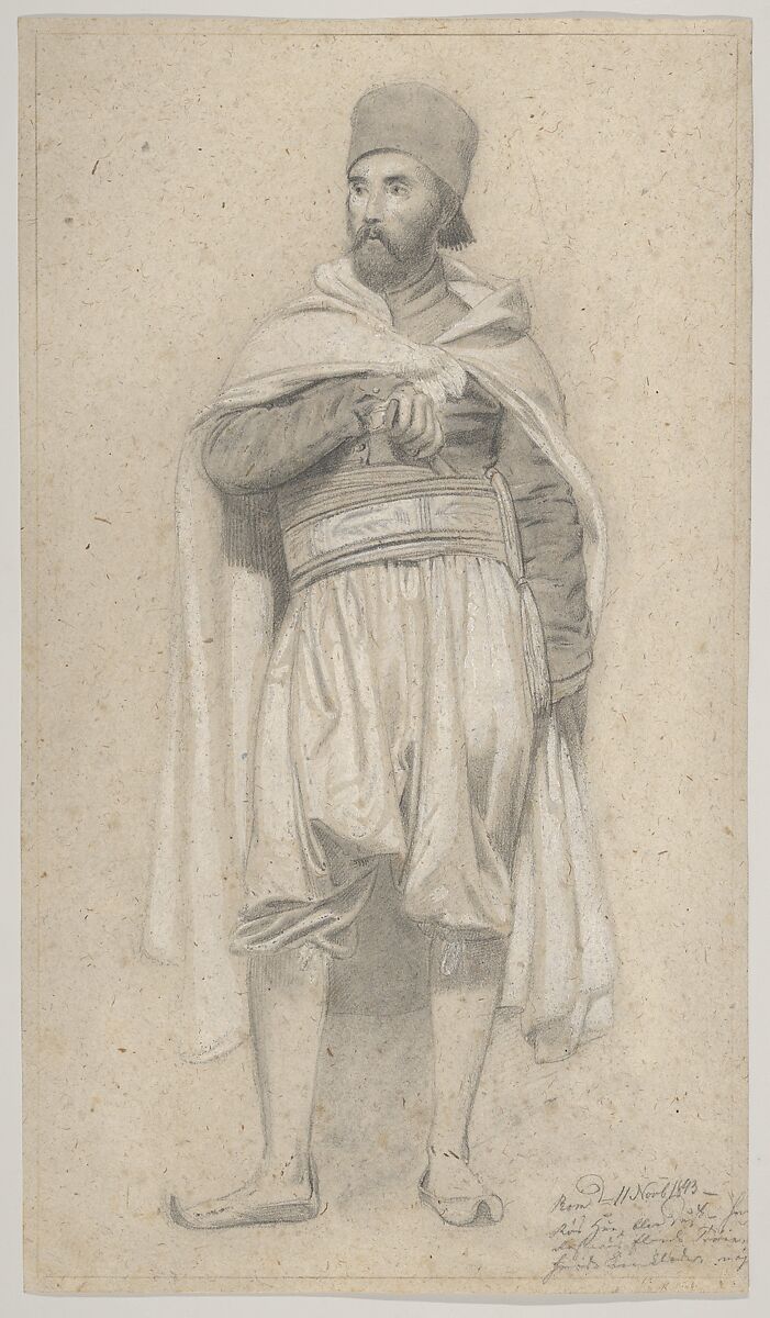 - Medium: Graphite, heightened with white, on oatmeal paper; framing lines in pen and brown ink