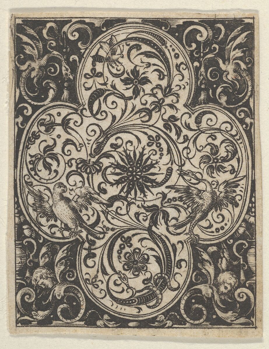 Ornamental design in quatrefoil at center, with eight-pointed floral shape in the middle, flanked by a bird at left and at right with an insect at upper left of quatrefoil. In the black background, grotesques with putti heads at lower left and right, and dragons at upper left and right. From a series of six plates of ornamental designs.