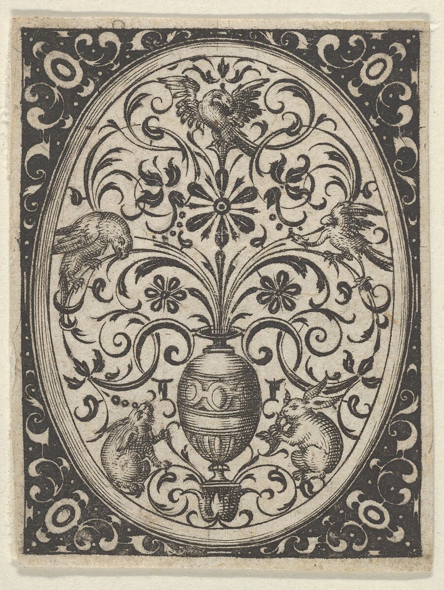 Ornamental design in oval at center, with vase at the bottom flanked by rabbits. Above, at left and right, two birds perched on foliate scrolls growing from the vase, with a third bird at top center. Oval framed and set against black background with ornamentation. From a series of six plates of ornamental designs.