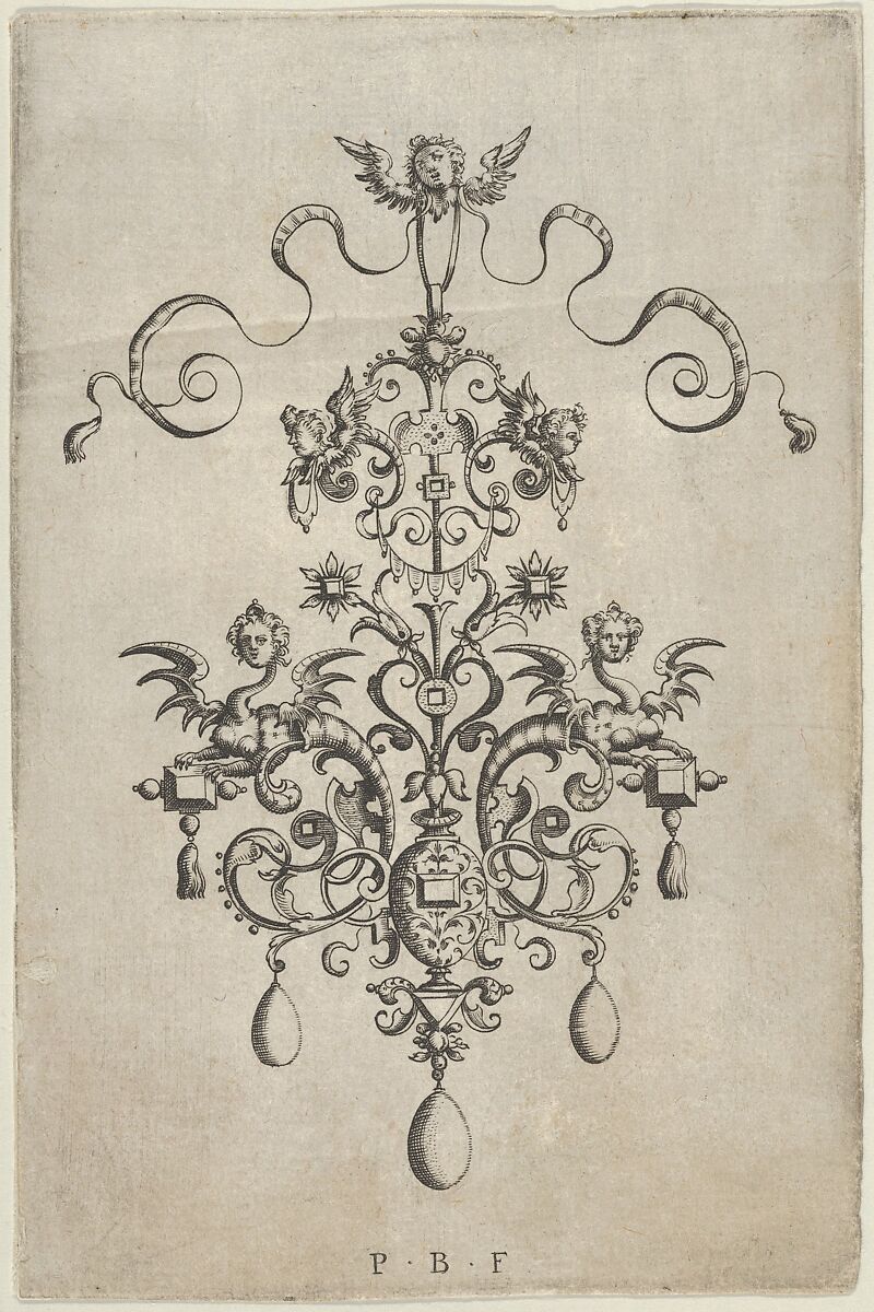 Design for a jewelry pendant, hanging from a putto mask (looking upwards to the left) and a ribbon at top, with three pearls descending from the bottom. Two hybrid figures with female heads and torsi, wings, and serpentine necks at left and right.