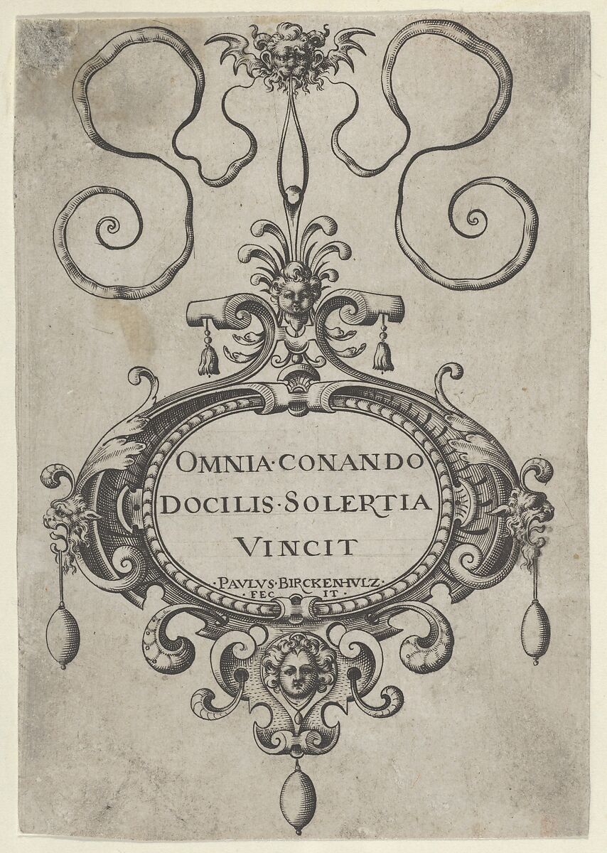 Ornament design with lettered title on cartouche at center, suspended from a horned mask at top, with three pearls hanging from below.