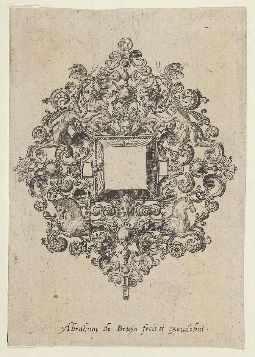 Ornament design for jewelry with square mirror at center, putto above, and cow's skull below. Flanking the skull are two half-length horses. From a series of six plates.