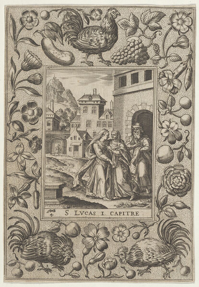 Scene of the Visitation at center, with Anne meeting Mary under an archway at right. Surrounding this scene, a wide frame with two roosters at the bottom and a chicken a top.
