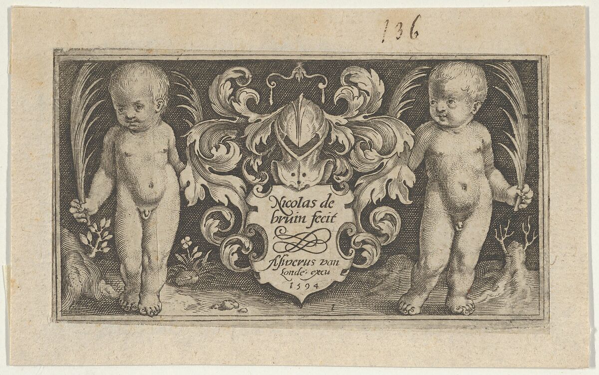 Two putti, holding ferns in each hand, flank a signed and dated plaque at center. Above the plaque, a helmet surrounded by foliage. From a series of six plates.