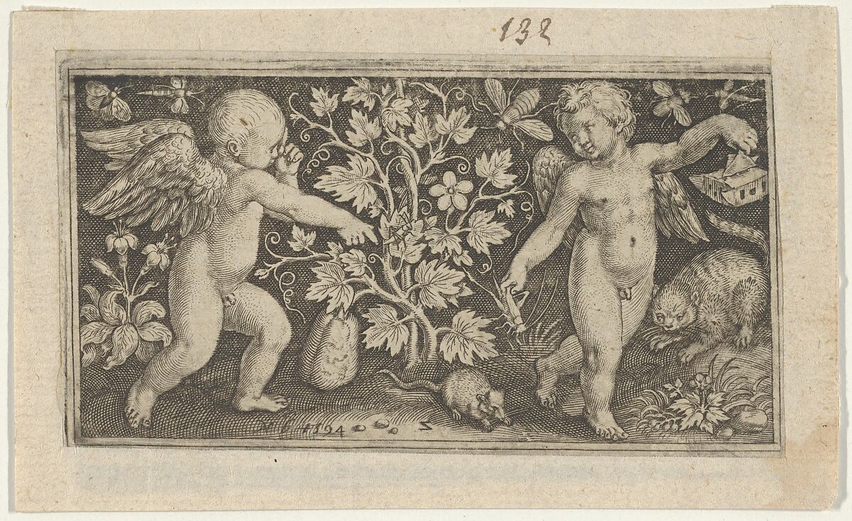 Two putti against a landscape with a plant growing a center and a rat below. At right, a putto holding a grasshopper in his right hand and a cat behind him at far right. From a series of six plates.