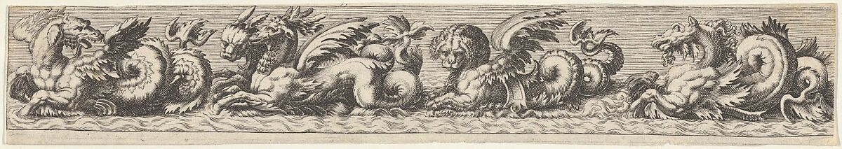 Frieze with five sea monsters, each with wings, horse-like front legs, serpentine tails, and heads of various beasts and animals, including that of a horse at far right. From a series of five plates after Giovanni Andrea Maglioli (SKB 4350).