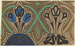 Horizontal Panel with a Pattern of Three Decorative Blue Flowers on a Semi-Circle Between Interlacing Green Lines, from a group of 158 textile designs from an unidentified French designer. The designs include brightly colored patterns and single motifs in late Art Nouveau and Art Deco styles. Most designs have been made on tracing paper and show signs of transfer. Some include instructions for execution, written in French.