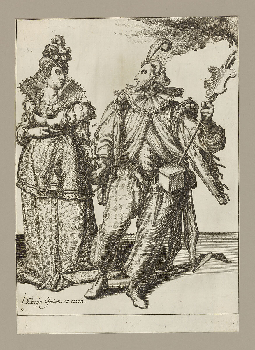 Composition of a male and a female figure holding hands. On the left side a masked woman is portrayed, she looks to the man at her side. The man looks back at her while he seems to be leading her somewhere. In his left hand he holds a burning torch onto which a blank cartouche has been attached.
