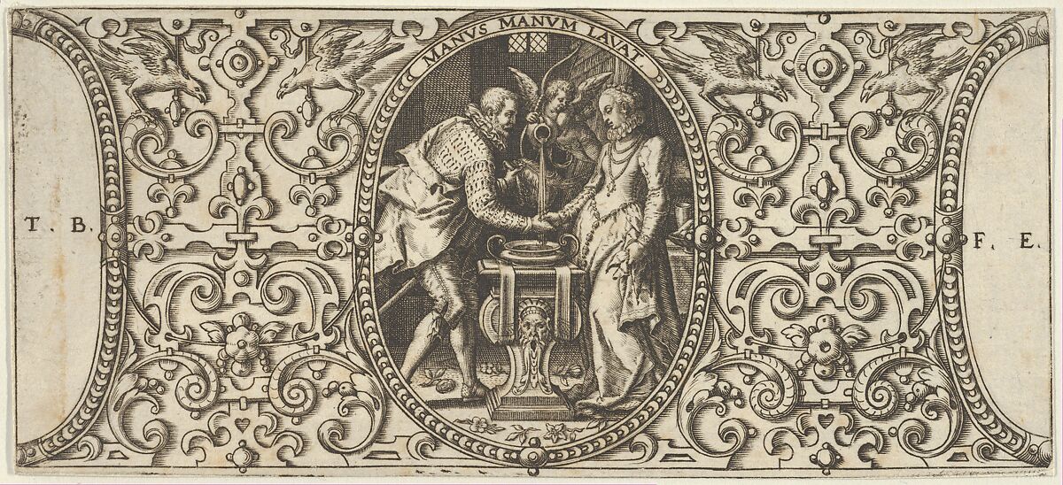 Framed in an oval at center, a man, at left, and woman, at right, shake hands, while a putto pours water over their hands and into a basin decorated with a grotesque mask. The oval is surrounded by symmetrical ornamental design with a pair of birds at the upper left and upper right. At the left and right edge, segmented ovals with the artist's signature. Associated with the series, Grotisch fur alle Kunstler, consisting of four plates.
