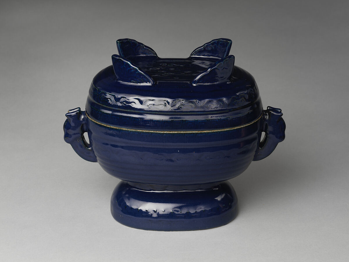 In the Qianlong emperor’s color-coded system, this blue ceramic vessel was used in state rituals held at the Altar of Heaven in Beijing. In shape and decoration, it was modeled on an ancient bronze grain receptacle.