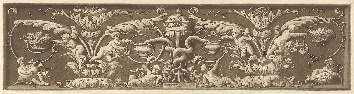 - Title: Ornamental frieze with putti and intertwined snakes, from Recueil de Différentes Compositions Frises et Ornements dessinées et gravées à la manière du lavis par La Grenée le Juene Se trouve chez l'Auteur, au Louvre et chez Basan, rue et Hôtel Serpente A Paris, in an album containing Recueil de Compositions par Lagrenée Le Jeune (Collection of Compositions by Lagrenée the Younger)