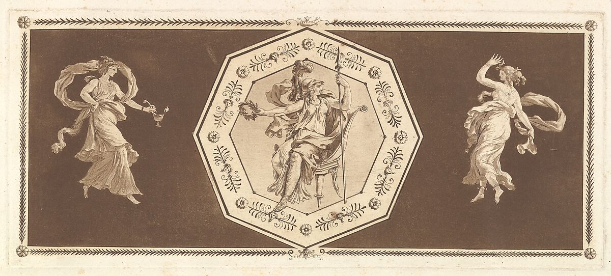Minerve assisse dans un octagone décoratif, avec une figure à gauche et à doroite (la Nuit et le Jour?) (Minerva seated within an octagonal border, wth a figure at the right and at the left (Night and Day?), from Recueil de Différentes Compositions Frises et Ornements dessinées et gravées à la manière du lavis par La Grenée le Juene Se trouve chez l'Auteur, au Louvre et chez Basan, rue et Hôtel Serpente A Paris, in an album containing Recueil de Compositions par Lagrenée Le Jeune (Collection of Compositions by Lagrenée the Younger)