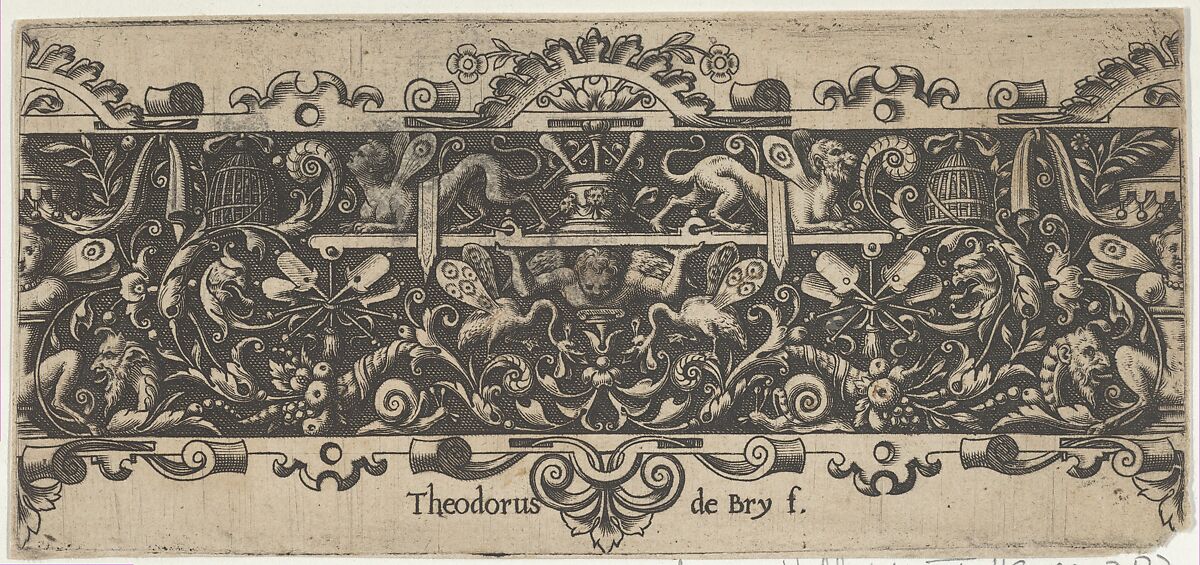 Frieze with dense grotesque ornament decoration on a black background. At center, a putto supports a platform with two outward-facing grotesques, each with human torsos, dog's bodies, and insect wings. The putto is flanked by birds with insect wings and cornucopias.