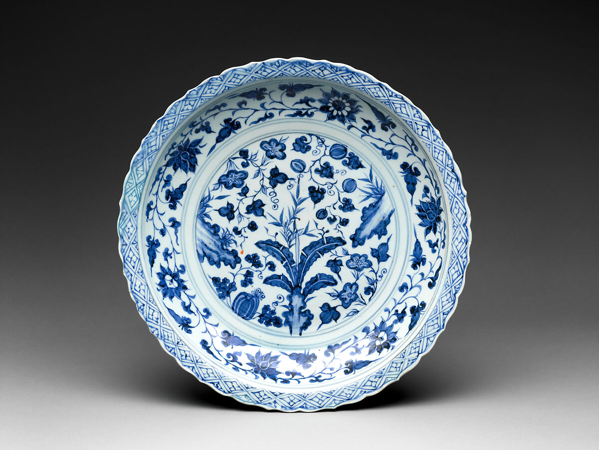 At the center of this plate is a scene of leafy plants, rocks, and melons surrounded by a ring of lotus scrolls. Such a vibrant and ordered composition sets the plate apart from the subtly hued monochrome glazes of Song ceramics. In the fourteenth century, potters at Jingdezhen mastered the technique of decorating porcelain with cobalt-blue pigment under a transparent glaze. The various blue hues and shading of the rocks here showcase the potter’s skill in the use of the brush.