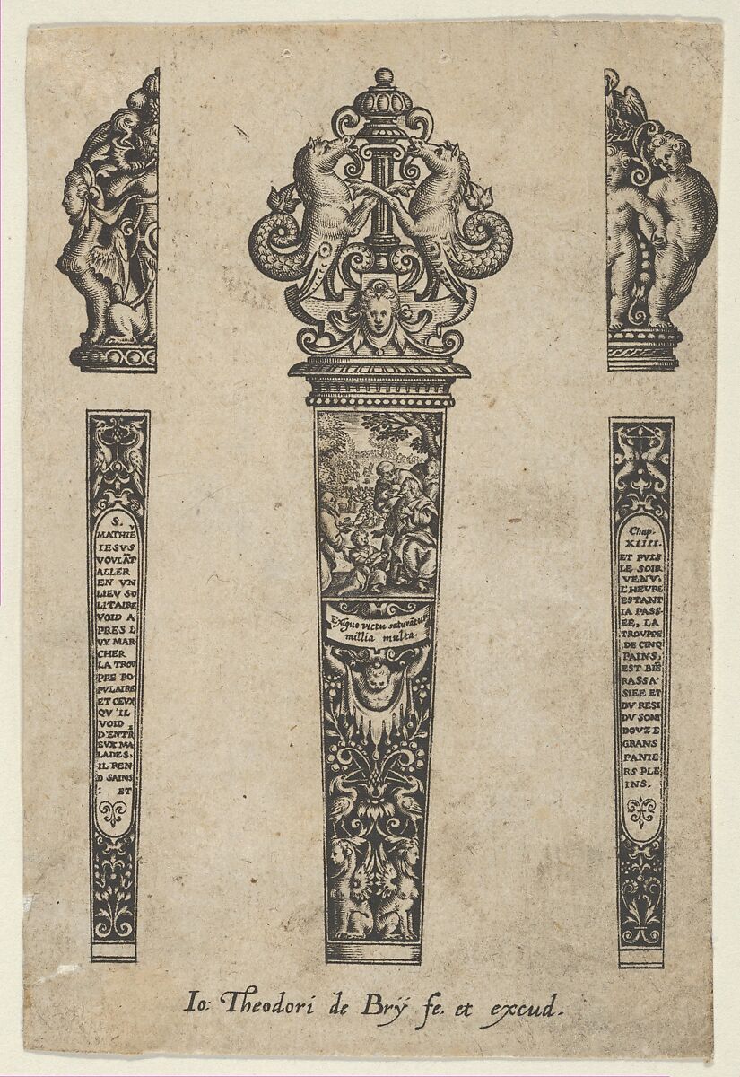 Design for a knife handle with the Sermont on the Mount in a rectangle at center, on a blackwork background with grotesques. Above, a design for a finial with a two horses with fish tails above a putto mask. Flanking the central design, two blades engraved with Biblical texts below alternate finial designs. From a series of twelve plates.