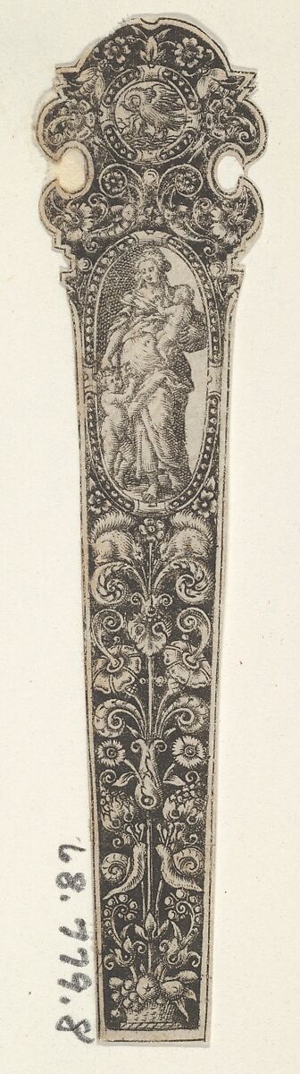 Design for a knife handle with Charity personified as a full-length female figure holding a child in her left arm and another at her right side, in an oval, above a candelabrum with squirrels and snails in blackwork.