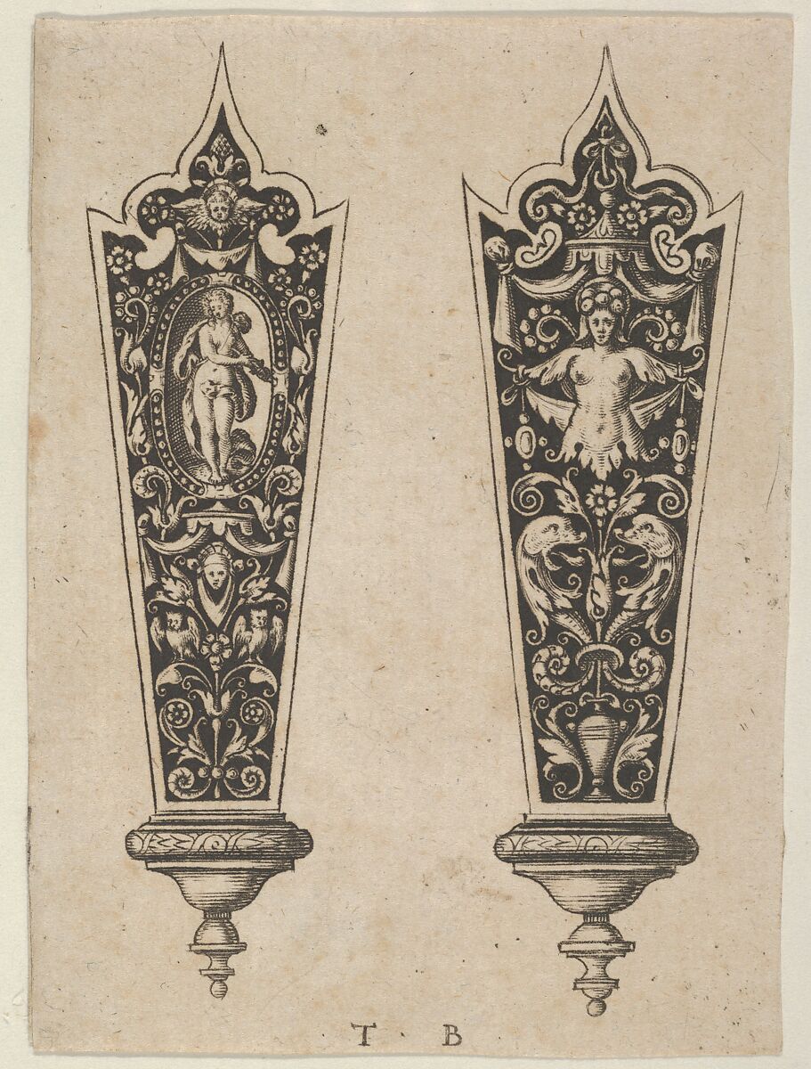 Design for a knife handle with the death of Lucretia on the design at left, contained in an oval surrounded by grotesque blackwork background, with two owls flanking a mask under a canopy below. On the right design, a half-length female figure with a headdress under a canopy, with a candelabrum with decorative dolphins below.