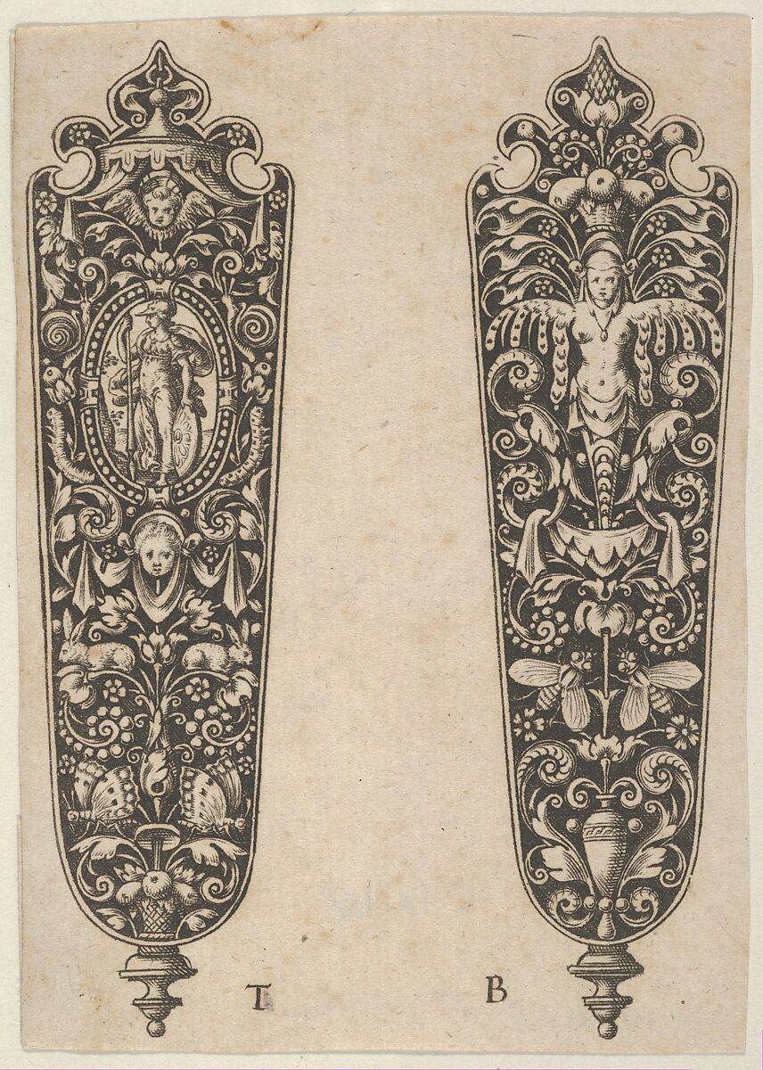 Two dagger handle designs. The one at left shows an armed female figure in an oval at center, above a putti mask with garland and two rabbits. The design at right depicts a female torso with wings at the top of a candelabra. Both designs are on a blackwork background with grotesques.