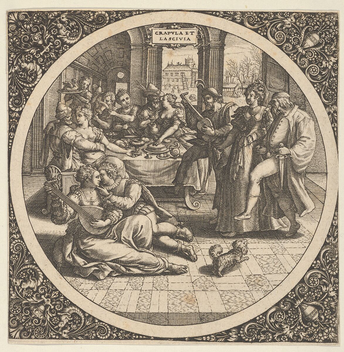 A scene with cavorting couples before a banquet, contained in a circle at center. At right, a couple with the man holding a knife walks left before a lute player. At lower left, a seated couple with the woman playing the lute. Around the central circle, ornamental floral designs with grotesque rabbits emerging from scrolling tendrils at upper and lower left corners. The scene in the circle is a reverse copy after a print by Jan Sadeler, after Maarten de Vos (Hollstein 558).