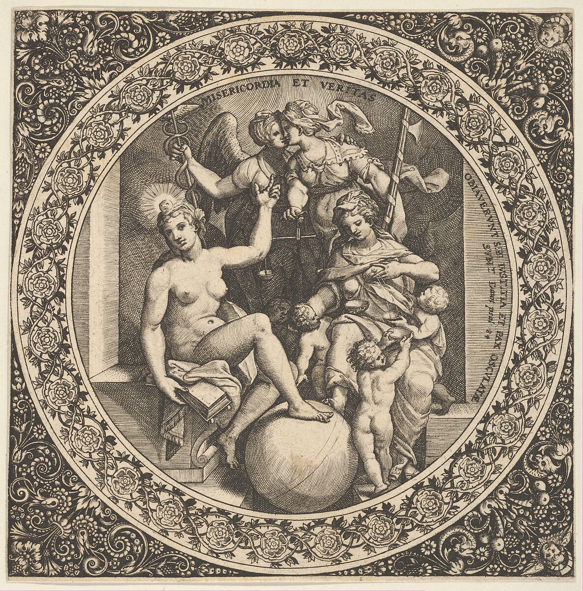 In a circle at center, a scene with misericordia (mercy) and veritas (truth) personified as female figures. In the forefront at left, a seated nude female figure with an open book places her right leg on a globe. At right, another figure feeds the children that surround her. Behind, two winged figures embrace, while the one at right holds a set of scales. Around the central circles, a band with rosettes. In the corners, ornamental blackwork with putti heads.