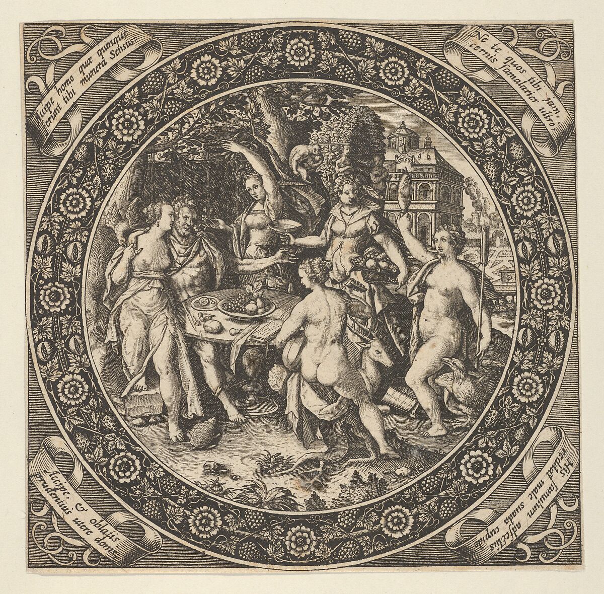 In a circle at center, a scene with the Feast of Love in a garden with a large building in the background at right. In the forefront, five female figures and one male figure dance around a table with fruit. The male figure, at left drapes his arm around one of the female figures, while the figure at the right holds a torch. Various animals, including an eagle at lower right, a turtle at lower left, and a monkey at top center, also appear in the celebration. Around the central circle, a band with rosettes and vines growing various fruits. In the corners, inscription in Latin on ribbons.