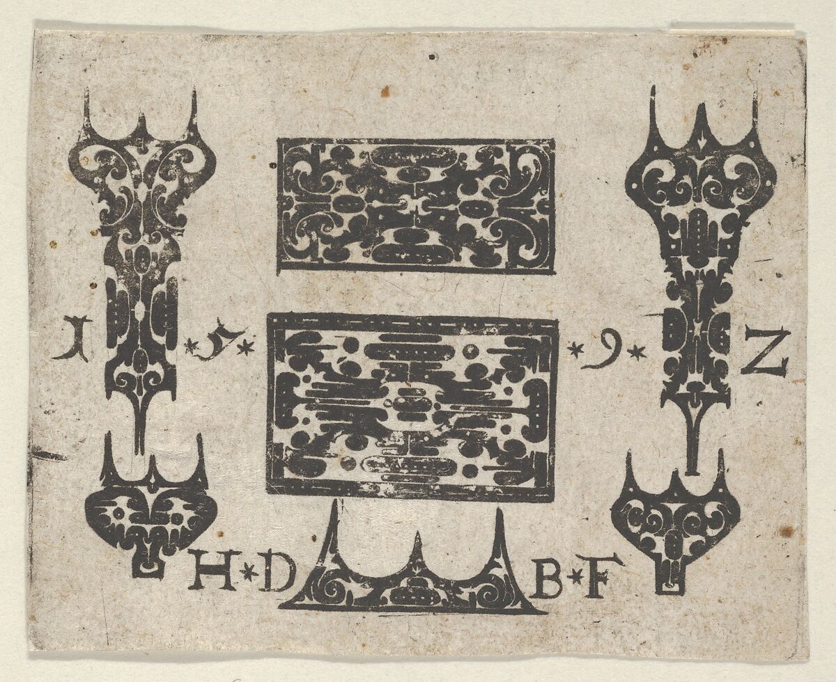 Small blackwork print with two horizontal panels with Schweifwerk flanked by longer bezels at top and shorter ones below. At bottom, a horizontal motif with three prongs.