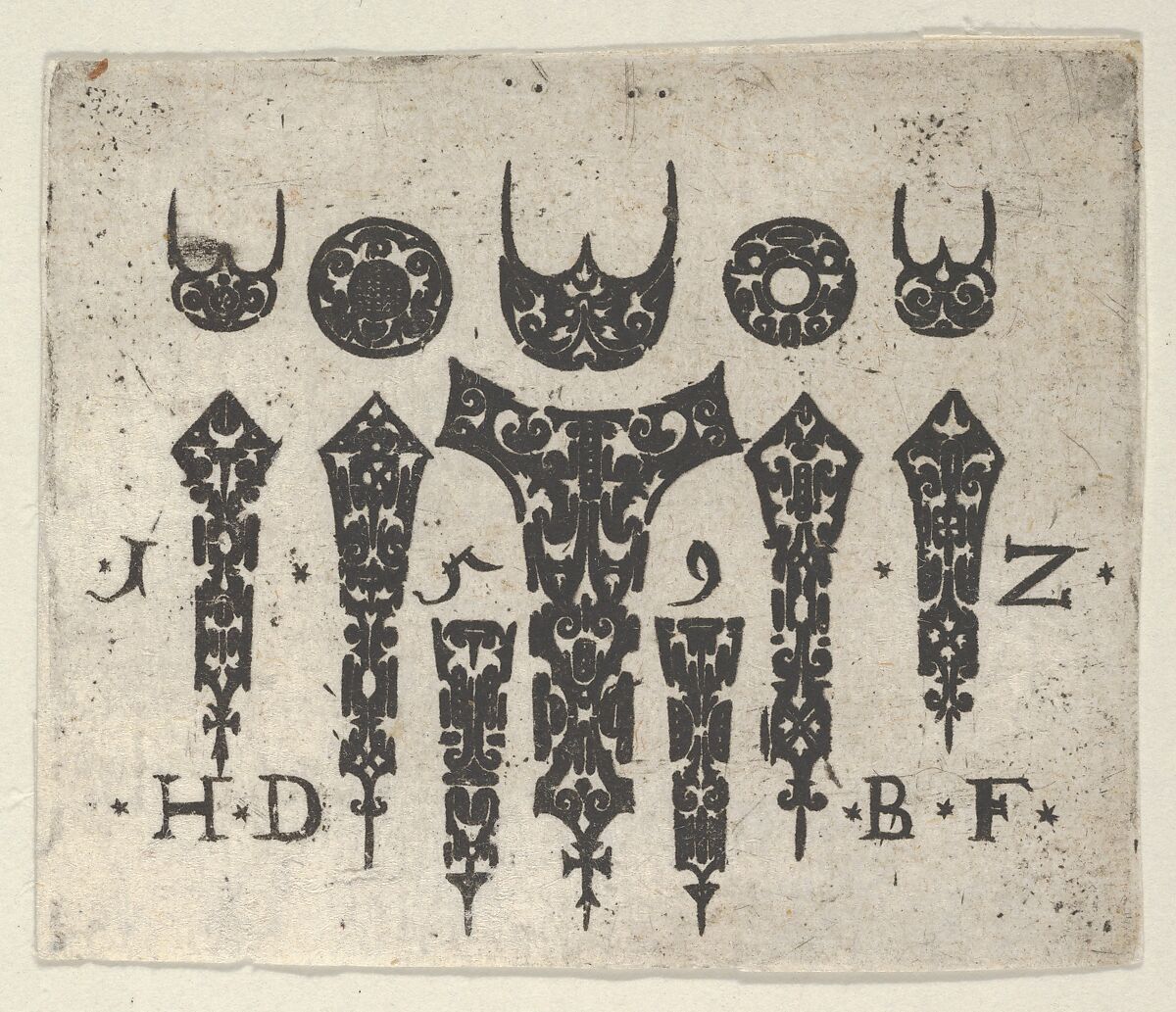 - Title: Blackwork Print with a Row of Seven Vertical Fillets Below a Row of Three-Pronged Motifs and Circles