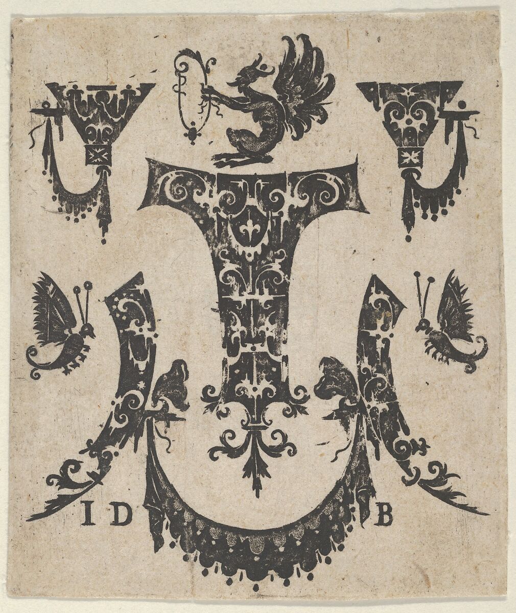 - Title: Blackwork Print with Five Ornament Motifs, a Pair of Butterflies and a Grotesque