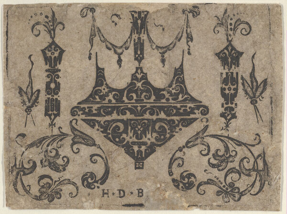 - Title: Blackwork Print with Four Ring Bezel Combined with C-Scrolls and Insects