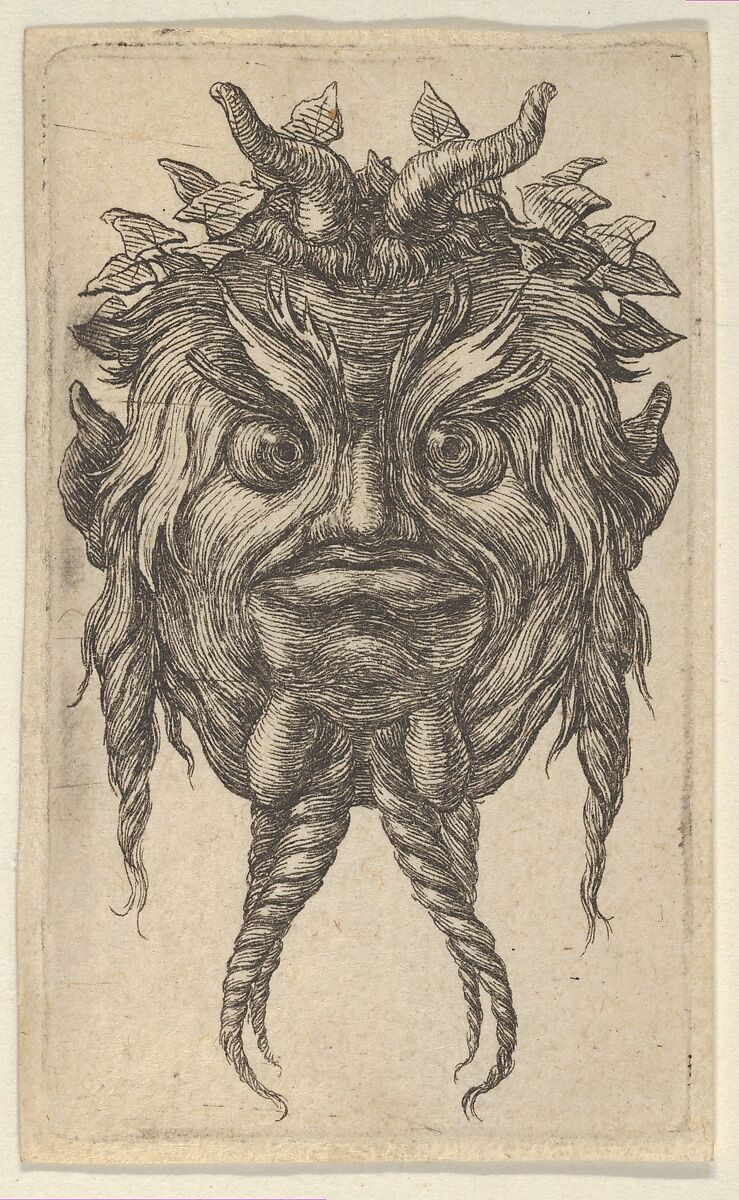 Satyr Mask with Horns and a Twisted Beard Wearing an Ivy Wreath, from "Divers Masques"