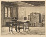 An interior view of a period room at the Metropolitan Museum of Art with a ladder backed chair next to a drop-leaf table, a casket resting on the table, and a cabinet against the wall flanked by side chairs.