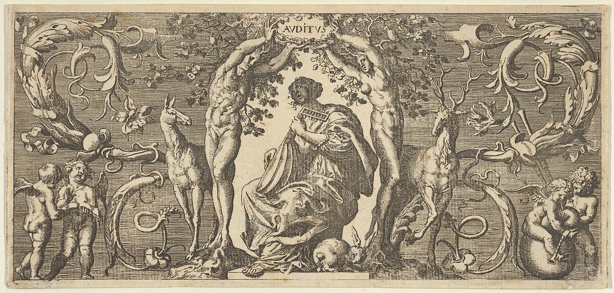 Horizontal panel with the personification of Auditus (Hearing) shown as a female figure playing the lute beneath an arch at center. The arch is formed by the figures of two nudes turning into trees (Actaeon at left and Diana at right) and reaching to support a plaque at top center. Flanking the central scene are a horse (at left) and a stag (at right). Pairs of winged putti are shown at the bottom left and right corner, with the two at left holding an open book and those at right playing the bagpipe while seated on an orb. The series, consisting of a title and five plates with the senses personified by female figures, is titled 'Quinque sensuum descriptio, in eo picturae genere quod (Grottesche) vocant Itali' (Description of the Five Senses in that kind of painting that the Italians call grotesque). This set belongs to the 3rd edition, published in London by Robert Walton after 1646 (ca. 1655). An inscription on the title plate (45.101.1) credits Walton as the publisher ('SOULD BY RO: WALTON), but there are visible traces of the name and address of the publisher of previous editions.