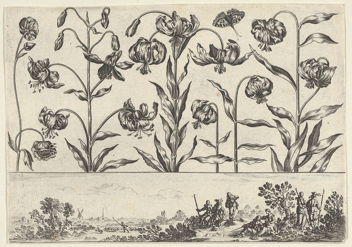 At top, a horizontal panel with a row of flowers, including a lily at right and a buttercup at left. Below, a frieze with a landscape, with three couples gathered around a tree at right and a windmill and steeple seen in the background at left. From a series of twelve plates with rows of flowers above friezes with landscapes, etched by Cochin, published by Balthazar Moncornet in Paris in 1645, and dedicated to the goldsmith, Jean de Leins. The prints are executed in a combination of etching, for the landscape, and burin, for the flowers.