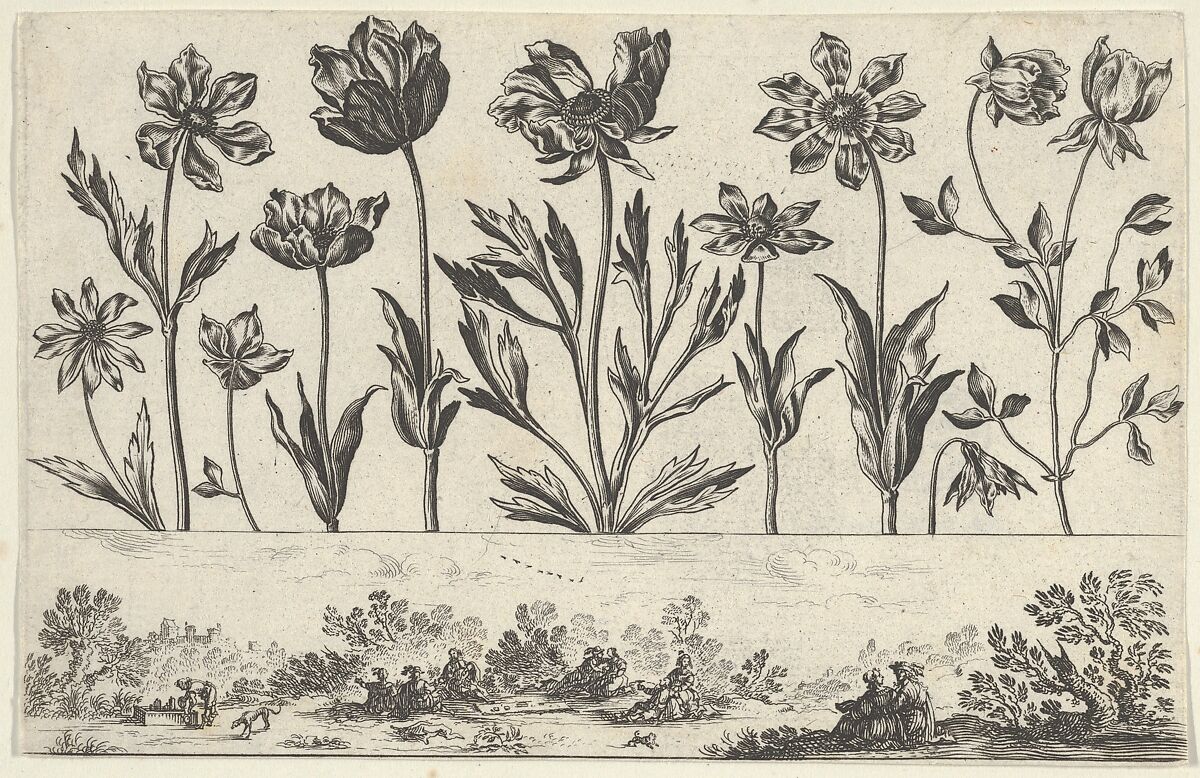 At top, a horizontal panel with a row of flowers, including a columbine at right. Below, a frieze with figures in a landscape. At right, a seated couple seen from behind, with a townscape in the background at left. From a series of twelve plates with rows of flowers above friezes with landscapes, etched by Cochin, published by Balthazar Moncornet in Paris in 1645, and dedicated to the goldsmith, Jean de Leins. The prints are executed in a combination of etching, for the landscape, and burin, for the flowers.