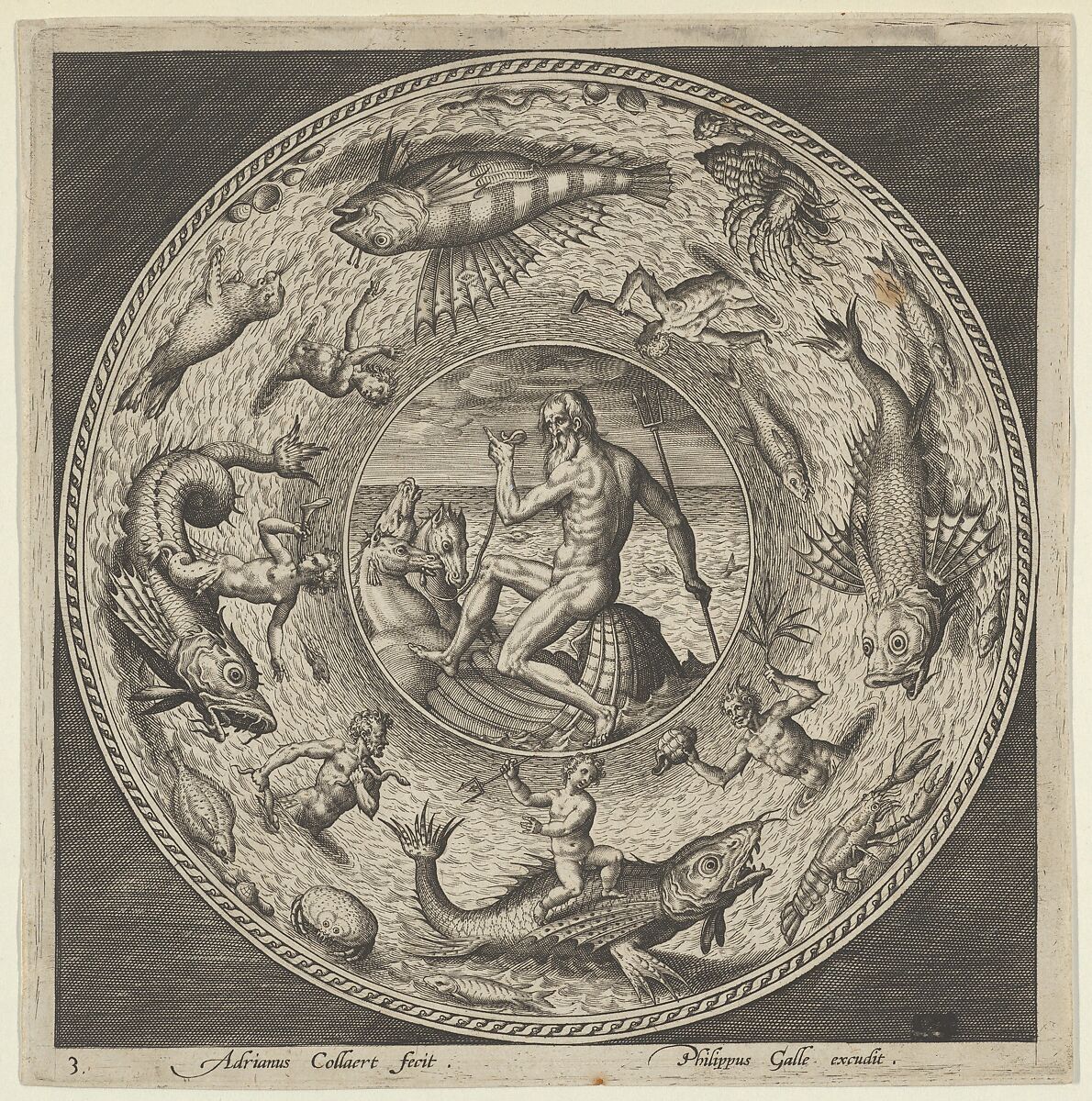 Design for a circular plate with Neptune seated on a shell being drawn by horses at left, set in a seascape. Plate 3 from a series of four plates, each showing a mythological figure associated with the sea in a medallion at center, surrounded by a broad border with various sea monsters and creatures.