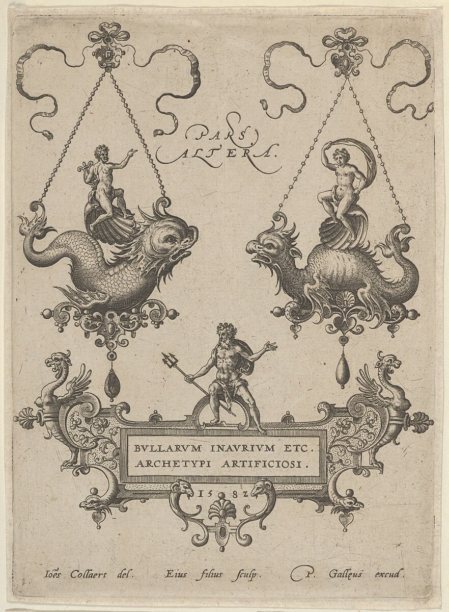 Vertical panel with two pendant designs above a strapwork cartouche with the title. Each pendant is suspended from a small jewelled motif tied with a ribbon and is composed of a sea-monster ridden by a nude figure on a shell. Below, Neptune, with his trident in his right hand, stands on the cartouche. Plate 1 from a series of ten plates with pendant designs in the shape of sea monsters. The series, known as Designs for Pendants II, was engraved by Adriaen Collaert, after designs by his father, Jan Collaert I, who died in 1580. Jan Collaert I produced several series of pendant designs, including the prequel to this series, Designs for Pendants I. This print belongs to the first edition, published in Antwerp by Philips Galle in 1582.