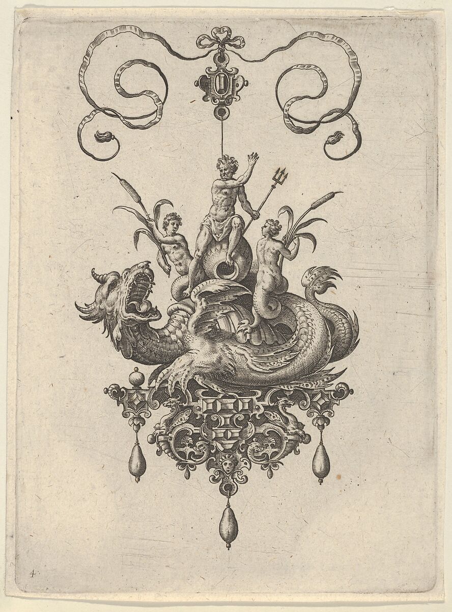 Vertical panel with a pendant in the shape of a sea monster ridden by Neptune, who sits on an overturned vase between two neirids. The ornament is suspended from a small jewelled motif tied with a ribbon at top. Plate 4 from a series of ten plates with pendant designs in the shape of sea monsters. The series, known as Designs for Pendants II, was engraved by Adriaen Collaert, after designs by his father, Jan Collaert I, who died in 1580. Jan Collaert I produced several series of pendant designs, including the prequel to this series, Designs for Pendants I. This print belongs to the first edition, published in Antwerp by Philips Galle in 1582.